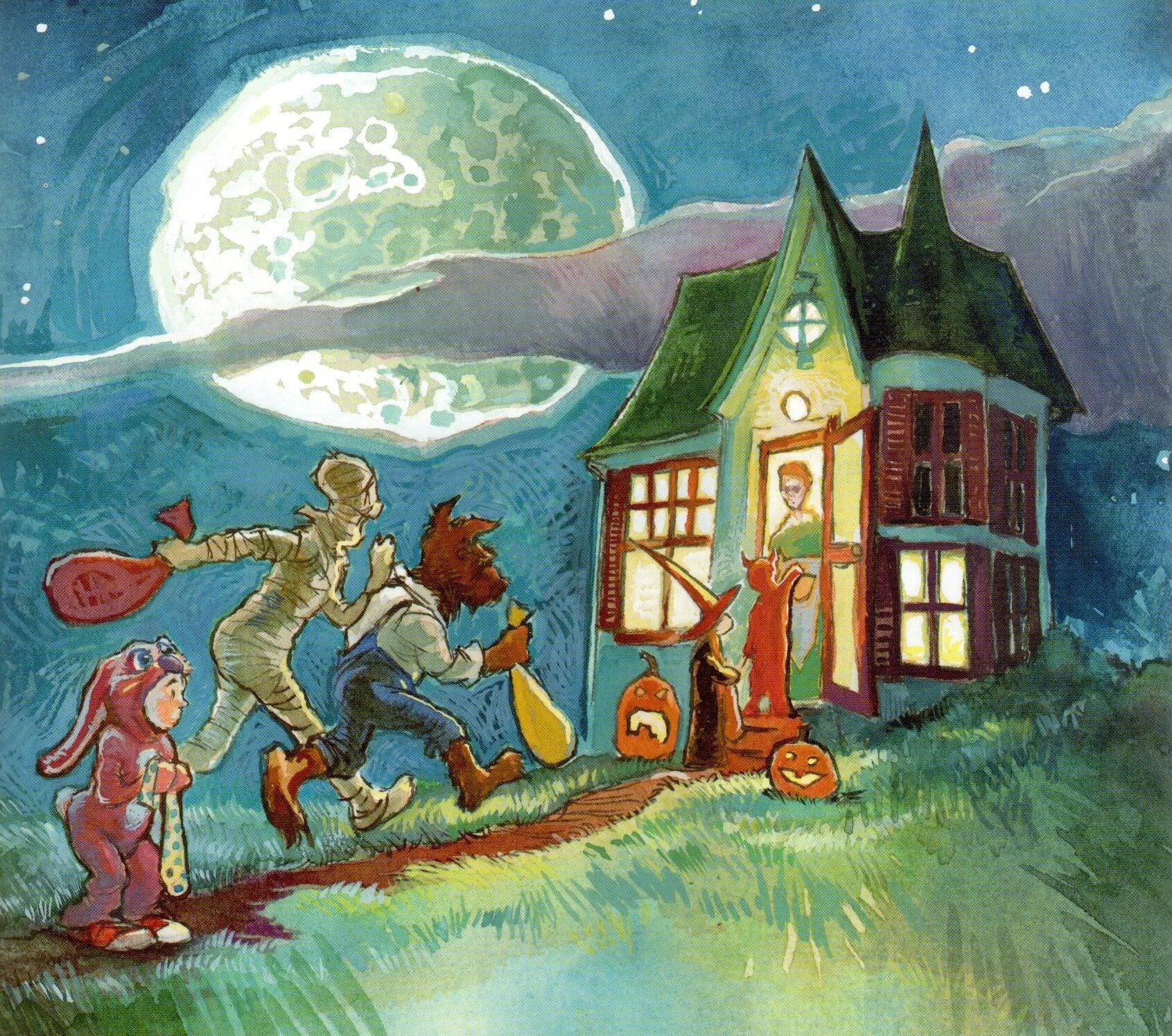 The boy’s dread of things that go bump in the night fills his head with monstrous thoughts. Lightning flashes. Bats flap overhead. Doors squeak open. Hairy arms and tentacles drop spiders into his sack. The boy is relieved when he finally meets up with another trick-or-treater. That is, until his new friend removes his mask…
